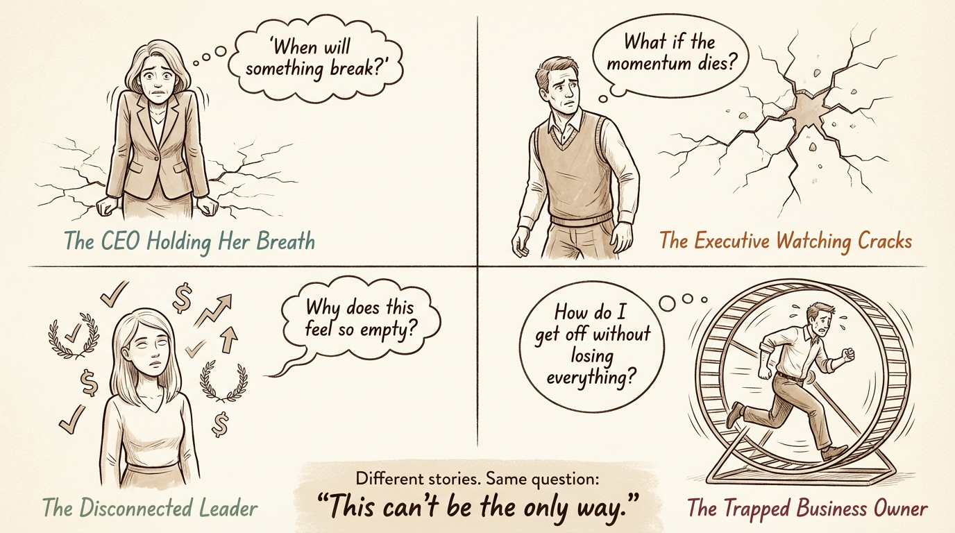 The executive leading a high-performing team who has started noticing the cracks. Morale isn't quite what it was, and a few key people seem worn thin. The culture that felt energizing two years ago now feels fragile, like one more push might break something. And he's terrified of slowing down because what if the momentum dies?